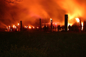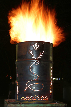 Kleine Elektromotoren versetzen die „Feuerblumenkarusselle“ und Feuersonnen in Bewegung Durch das Befeuern unserer Feuertonnen, in die alte mythische Symbole eingebrannt wurden, erhält der Veranstaltungsplatz ein Klima, das die Gäste zum Verweilen einlädt. |